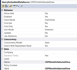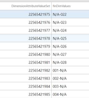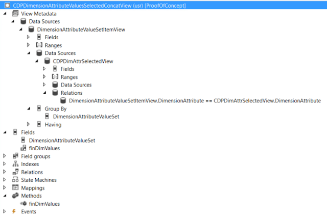 ============== Following my previous posting How to filter existing transactions based on a financial dimension value set , I would like to show how we can construct a view with all financial dimenion values for a given hierarchy, including placeholders for those values are absent. In the aforementioned example, it was CDPDimensionAttributeValuesUnionConcatView view as depicted. Instead of a series of dependant views, we can create one view as follows (CDPDimAttrSelectedView is just a set of selected attributes; explained in the previous link) The key point is a computed column method, which creates a final string in the same sequence of attributes as selected in the hierarchy. private static server str finDimValues() // X++ { return @"STUFF((SELECT '-' + ISNULL( STUFF((SELECT '-' + t3.DisplayValue from DimensionAttributeValueSetItemView as t3 JOIN DimensionHierarchyLevel as t17 on t17.DIMENSIONATTRIBUTE = t3.DIMENSIONATTRIBUTE join CDPFinDimAttrForAggr t25 on t17.DIMENSIONHIERARCHY = t25.DIMENSIONHIERARCHY where t1.DimensionAttributeValueSet = t3.DimensionAttributeValueSet and t7.DIMENSIONATTRIBUTE = t3.DIMENSIONATTRIBUTE order by t17.LEVEL_ FOR XML path('') ), 1, 1, '') , 'N/A') FROM DIMENSIONATTRIBUTE t6 JOIN DimensionHierarchyLevel as t7 on t7.DIMENSIONATTRIBUTE = t6.RECID join CDPFinDimAttrForAggr t15 on t7.DIMENSIONHIERARCHY = t15.DIMENSIONHIERARCHY FOR XML PATH('')), 1, 1, '')"; } Thanks a lot for all participants on the forum thread, and especially to Kair84 who helped me with SQL command. Источник: http://alexvoy.blogspot.com/2019/08/...dimension.html